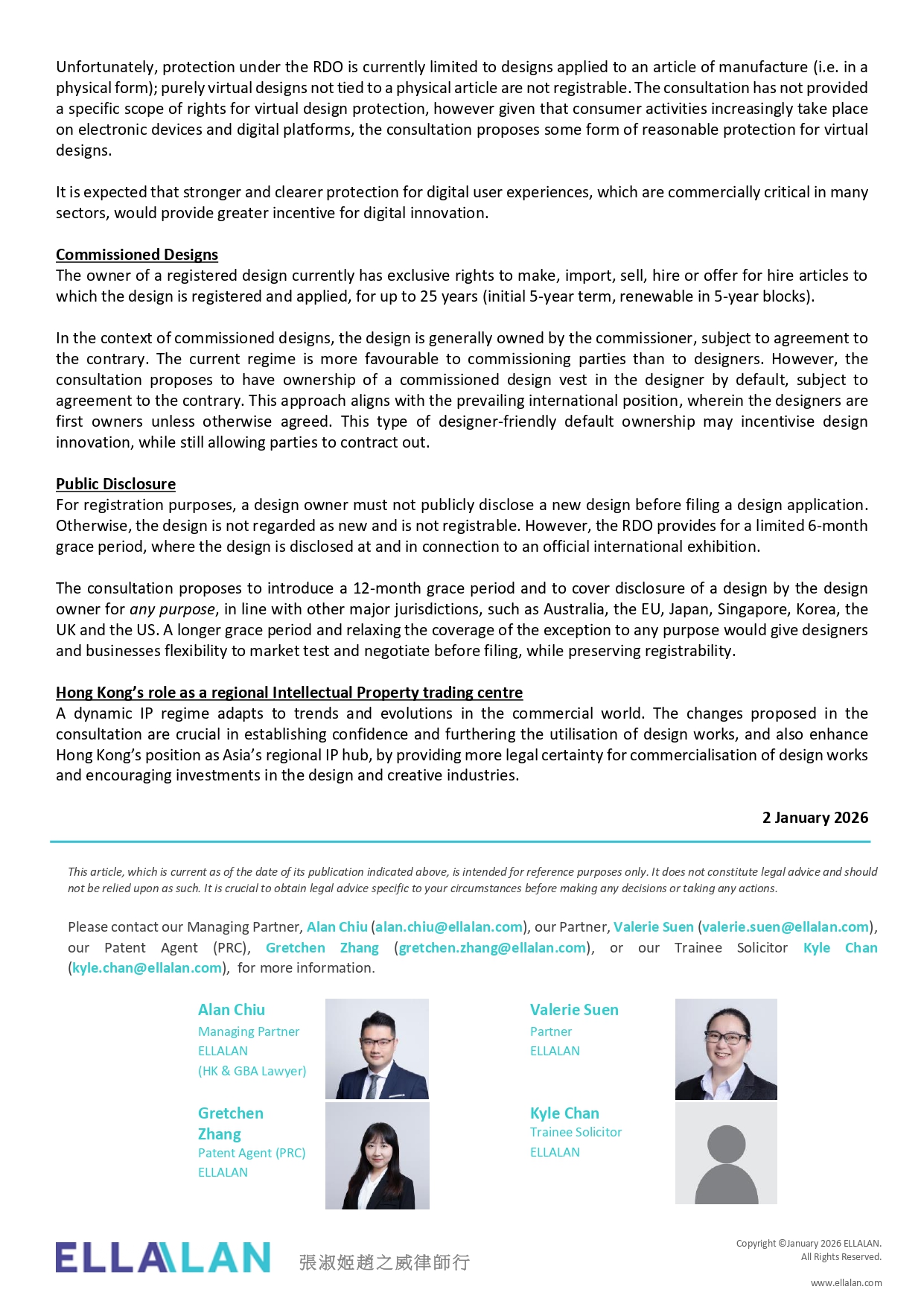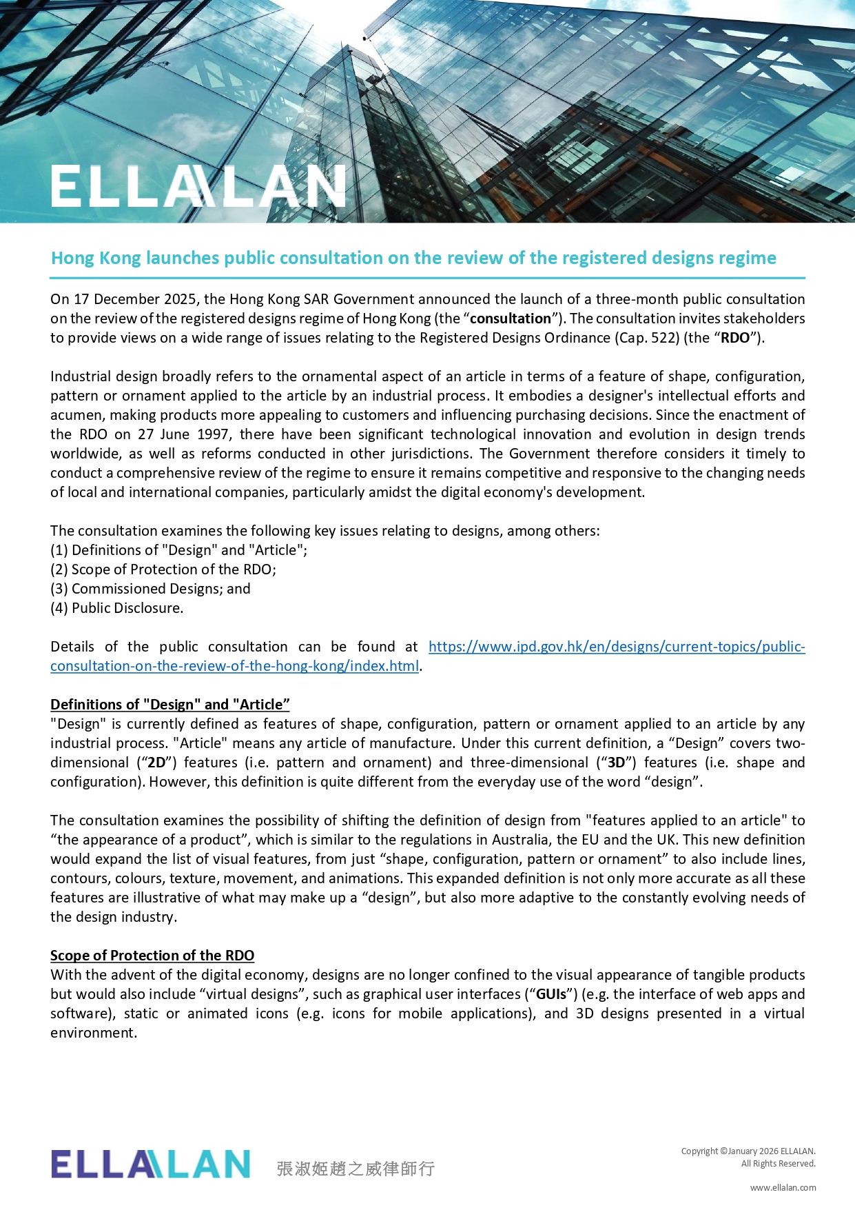 Our Managing Partner Alan Chiu, Partner Valerie Suen, Patent Agent (PRC) 张嘉辰, and Trainee Solicitor Kyle Matthew Yu Chan have co‑authored an article examining the Hong Kong SAR Government’s recent public consultation on the review of the Registered Designs Ordinance (Cap. 522).
