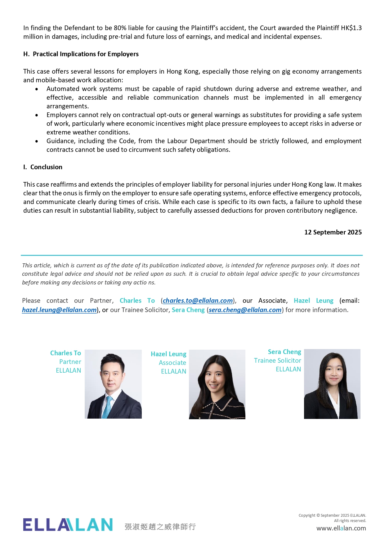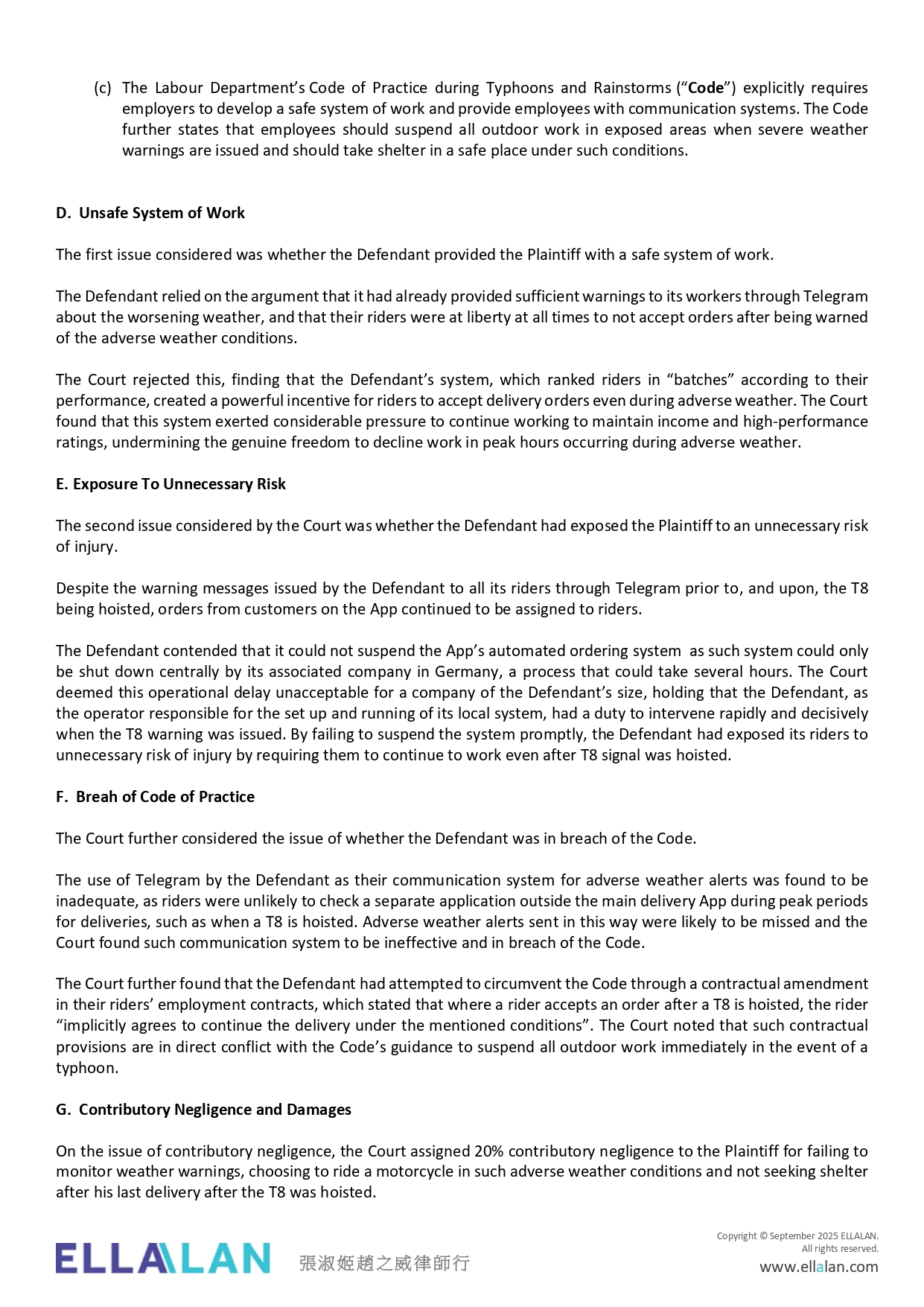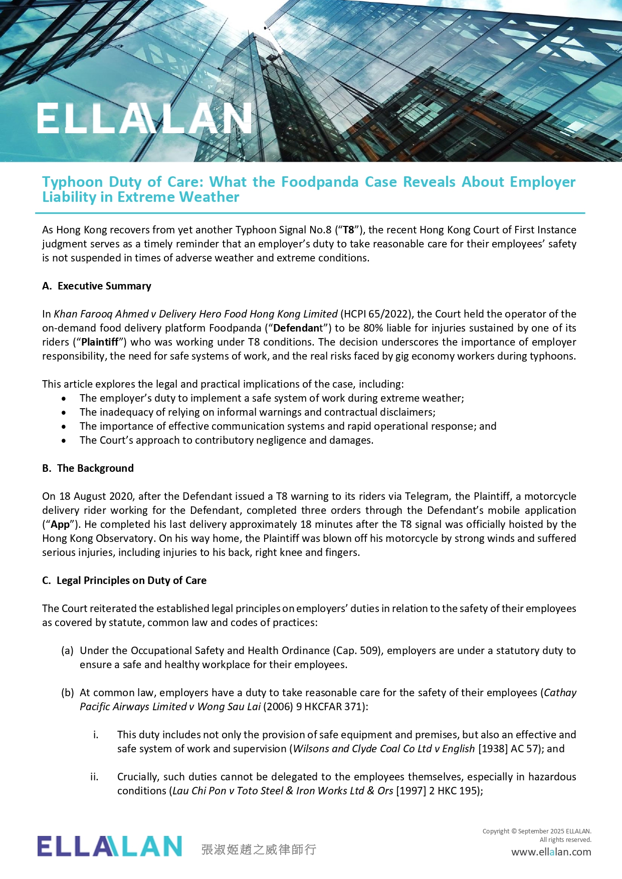 The Court found Foodpanda 80% liable for injuries suffered by a rider working under Typhoon Signal No.8, underscoring that an employer’s duty of care is not suspended during extreme weather.